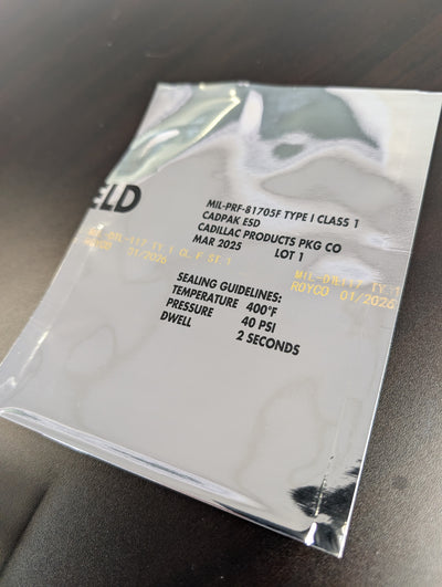 Every SpecPack™ barrier bag is tested and certified to MIL-DTL-117H, Type I, Class F, Style 1 specifications, delivering waterproof and greaseproof protection for defense, aerospace, and critical industrial components. Material certification to MIL-PRF-81705, Type 1 ensures consistent barrier performance across every lot.